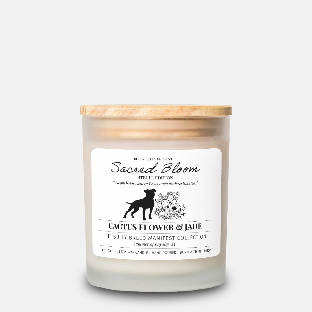 Embrace the essence of strength and resilience with the Sacred Bloom 11 oz hand-poured candle, inspired by the American Pitbull Terrier. Featuring the uplifting scent of Cactus Flower & Jade, this candle invites you to bloom boldly, echoing its manifestation quote: “I bloom boldly where I was once underestimated.” With vibrant notes of aloe, agave, and earthy patchouli, this clean-burning coconut apricot blend creates an aromatic sanctuary. Housed in a stylish matte-frosted glass, it’s a celebration of nature's beauty and the unwavering spirit of dog lovers. Experience a burn time of approximately 50 hours, hand-poured with love in the USA. Perfect for your daily ritual of empowerment.