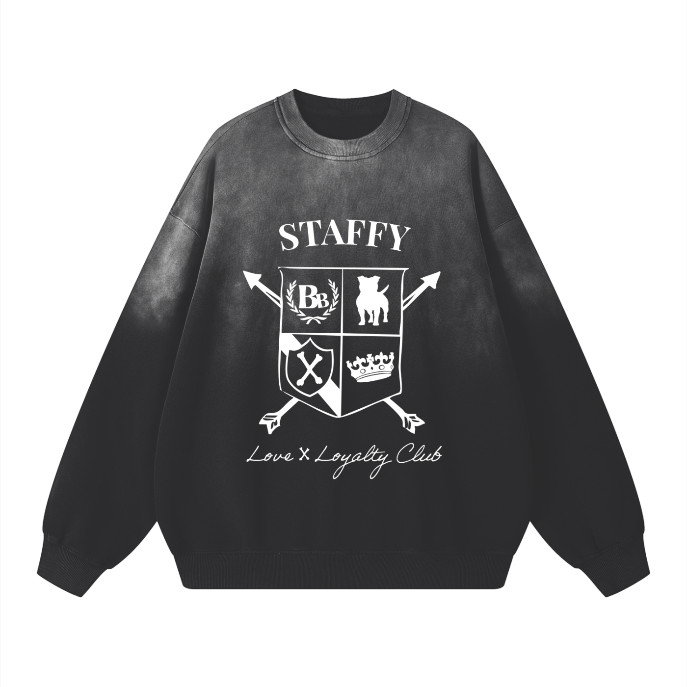 - Front: DTG-printed Staffy Heritage Crest (white print)